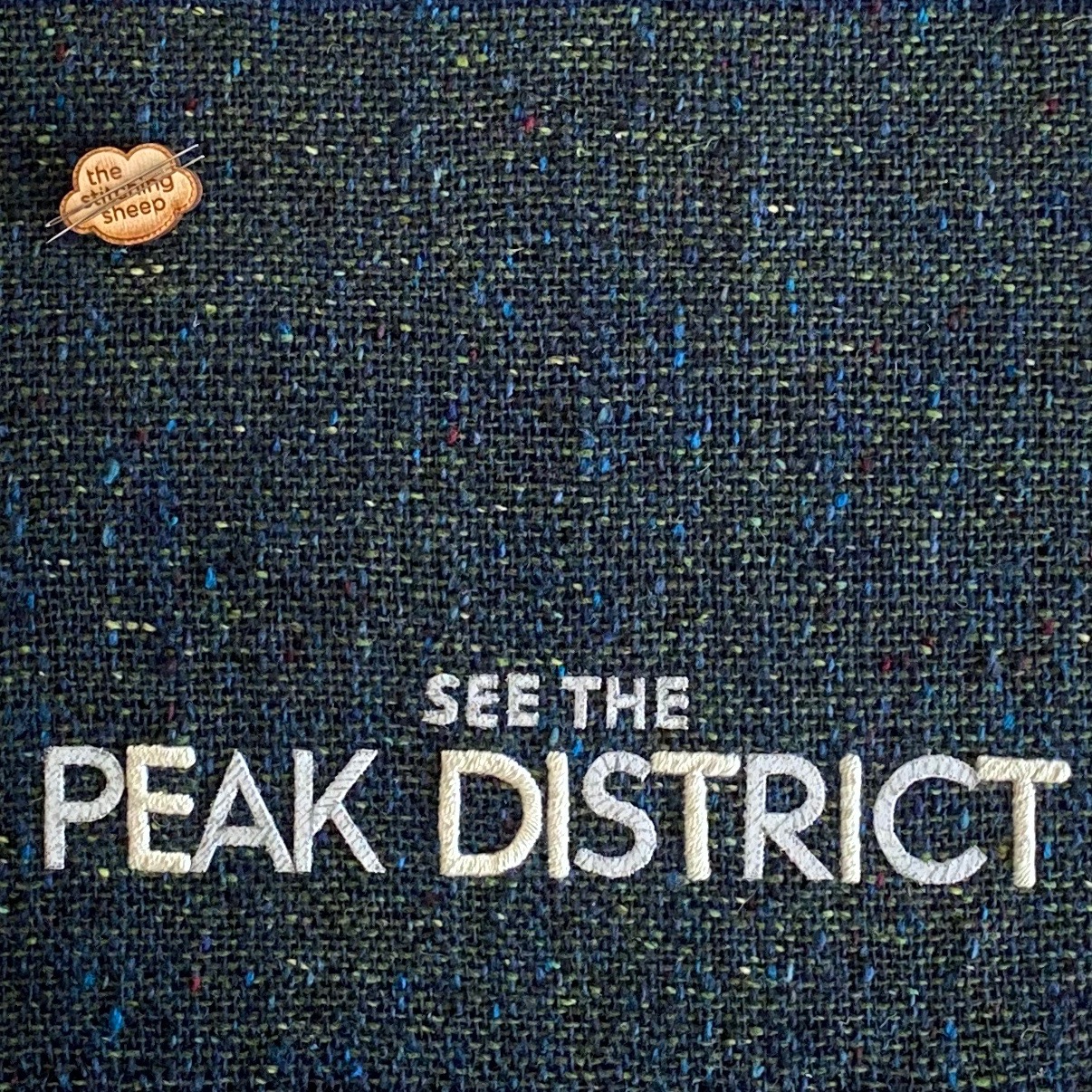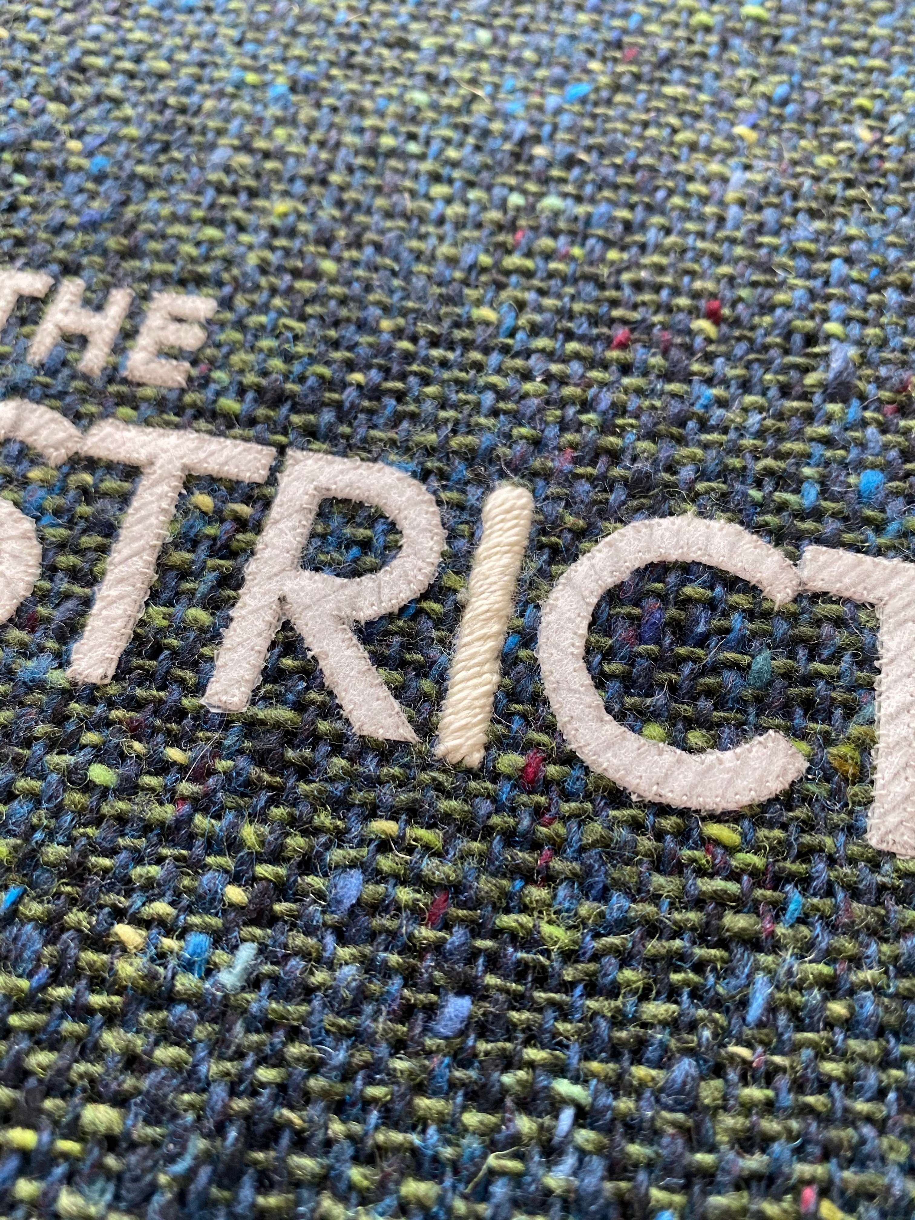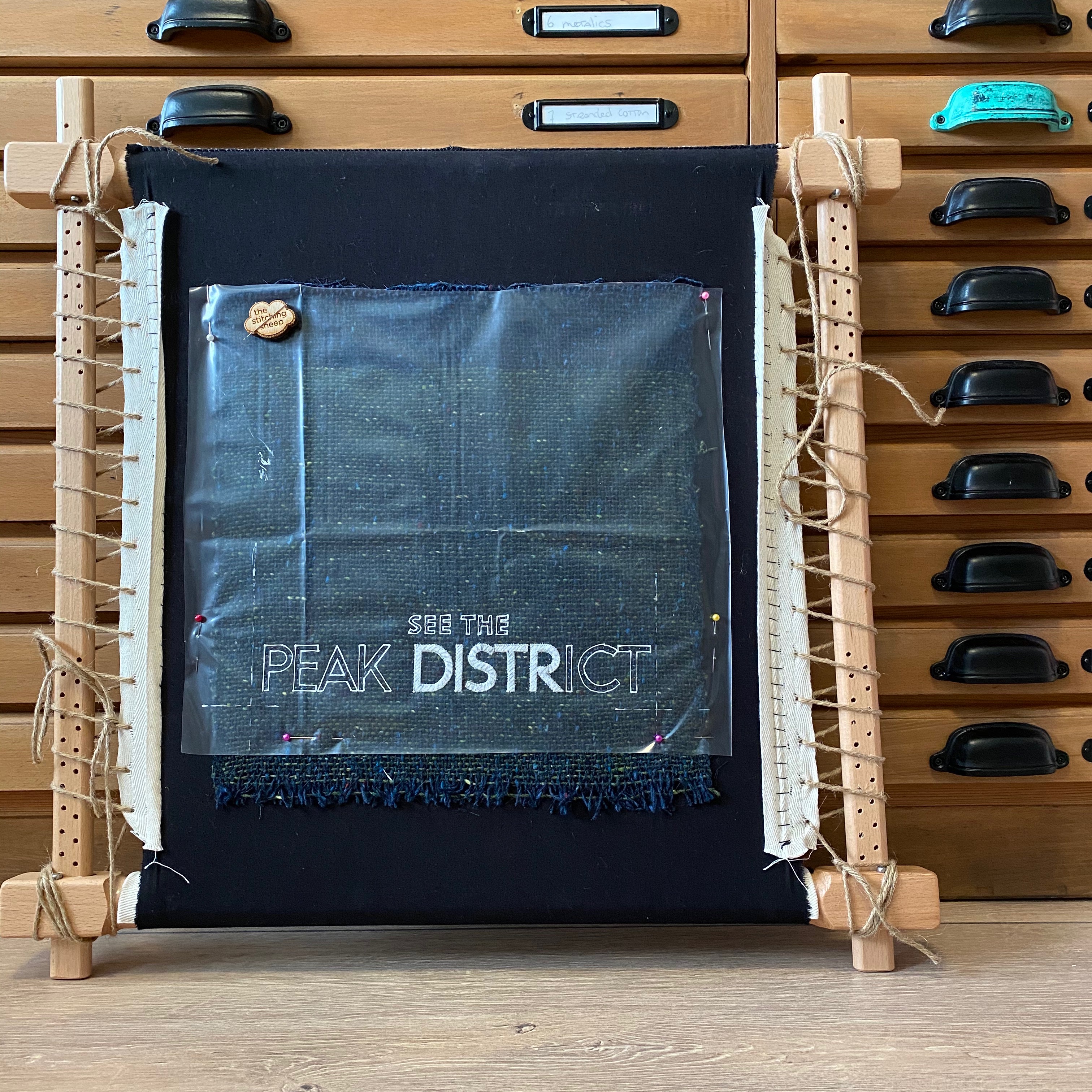 The only fabric I could not find was a dark blue/green fabric for the foreground. I wanted a textured fabric, like a tweed, but nothing was quite the right colour. I considered dyeing something until I had another look through my stash and spotted the green and blue Donegal tweed yarns I had bought from the Handweaver’s Gallery for my RSN Certifcate Canvaswork project. I thought then I could weave my own fabric on my Cricket Rigid Heddle loom. After a bit of experimenting I discovered that a combination of the blue for the weft and the green for the weave made the perfect colour. However, as the fabric would be too loose to embroider the letters on to I decided to strengthen it with a black cotton fabric. Having it framed up in my new 15″ Jenny Adin-Christie slate frame it made it much easier to stitch on the letters.