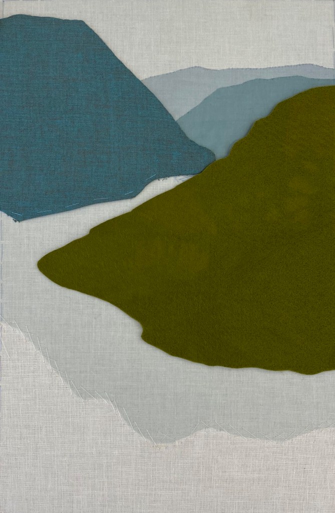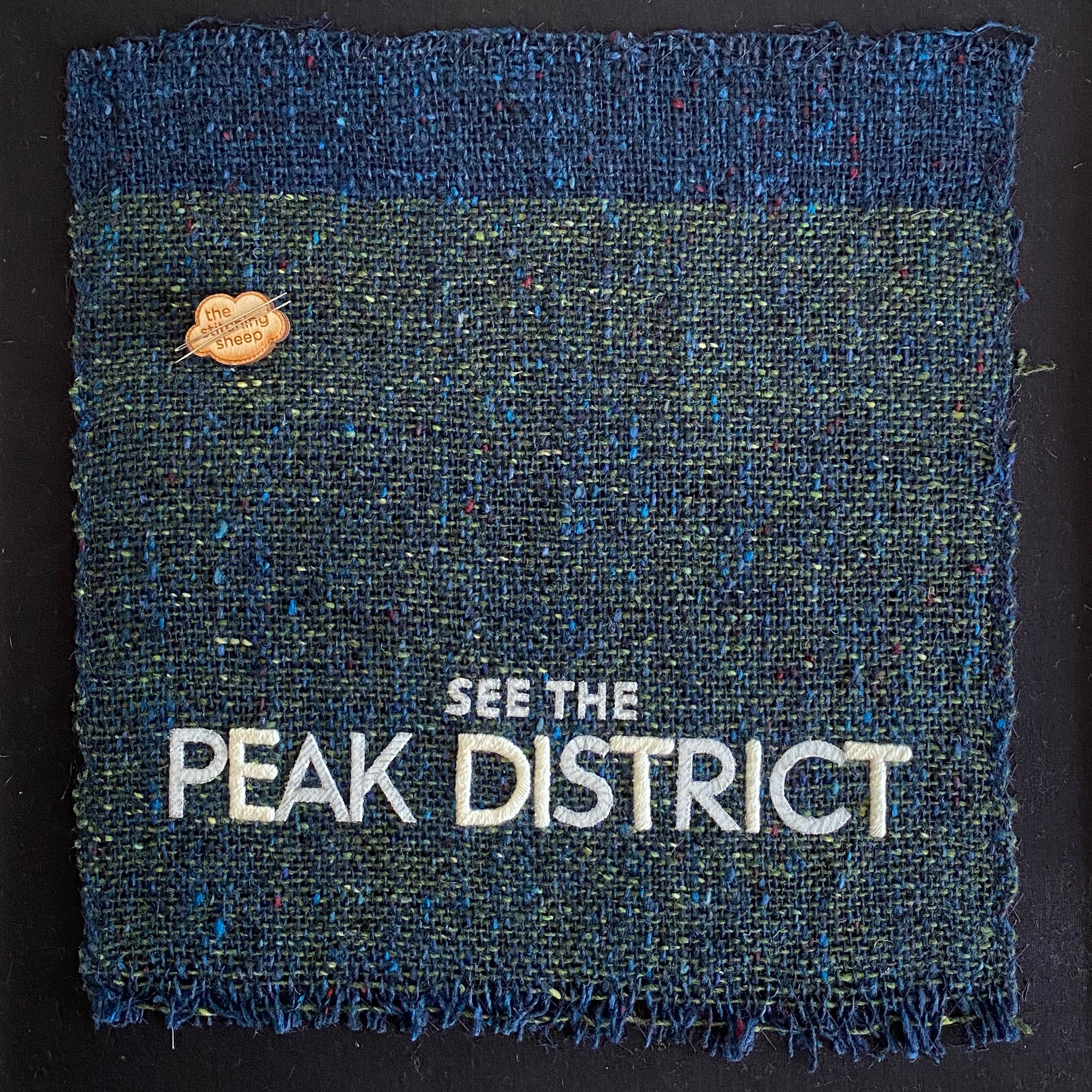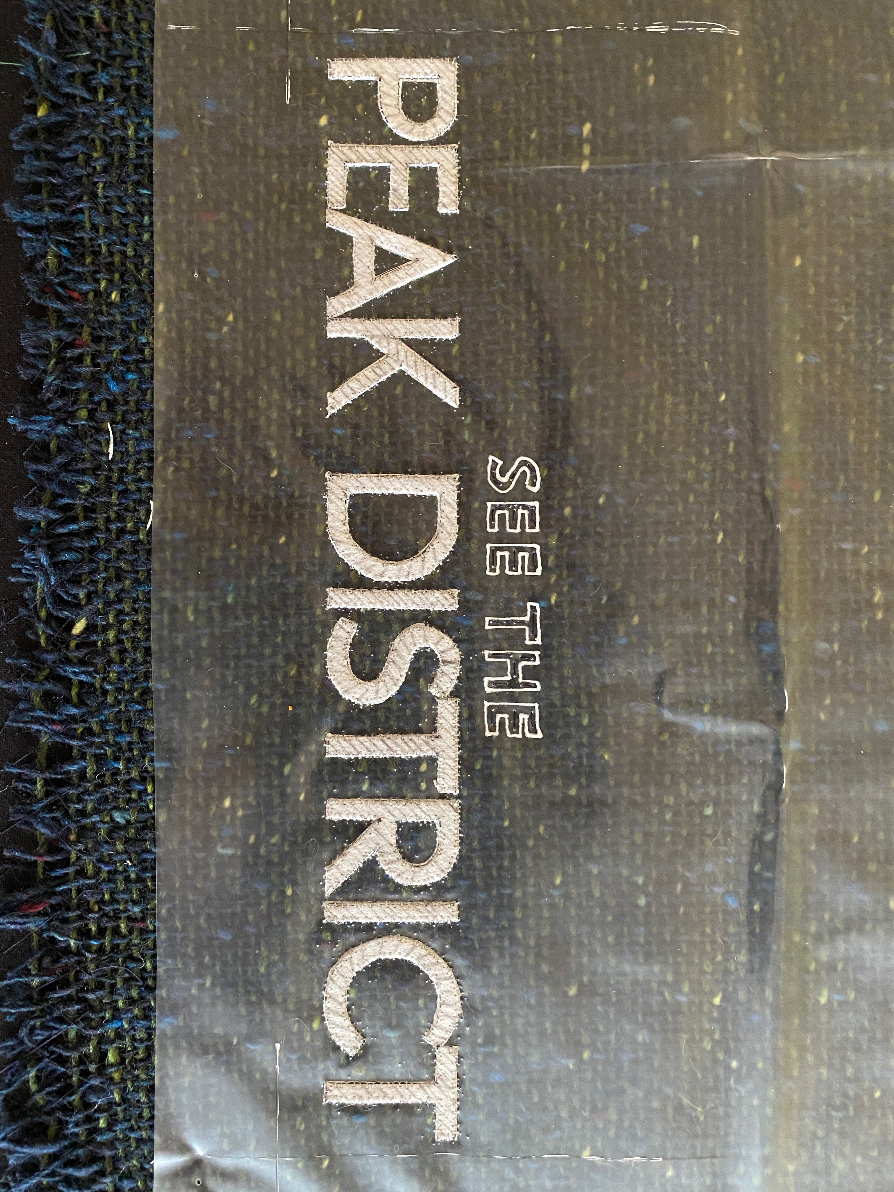 The only fabric I could not find was a dark blue/green fabric for the foreground. I wanted a textured fabric, like a tweed, but nothing was quite the right colour. I considered dyeing something until I had another look through my stash and spotted the green and blue Donegal tweed yarns I had bought from the Handweaver’s Gallery for my RSN Certifcate Canvaswork project. I thought then I could weave my own fabric on my Cricket Rigid Heddle loom. After a bit of experimenting I discovered that a combination of the blue for the weft and the green for the weave made the perfect colour. However, as the fabric would be too loose to embroider the letters on to I decided to strengthen it with a black cotton fabric. Having it framed up in my new 15″ Jenny Adin-Christie slate frame it made it much easier to stitch on the letters.