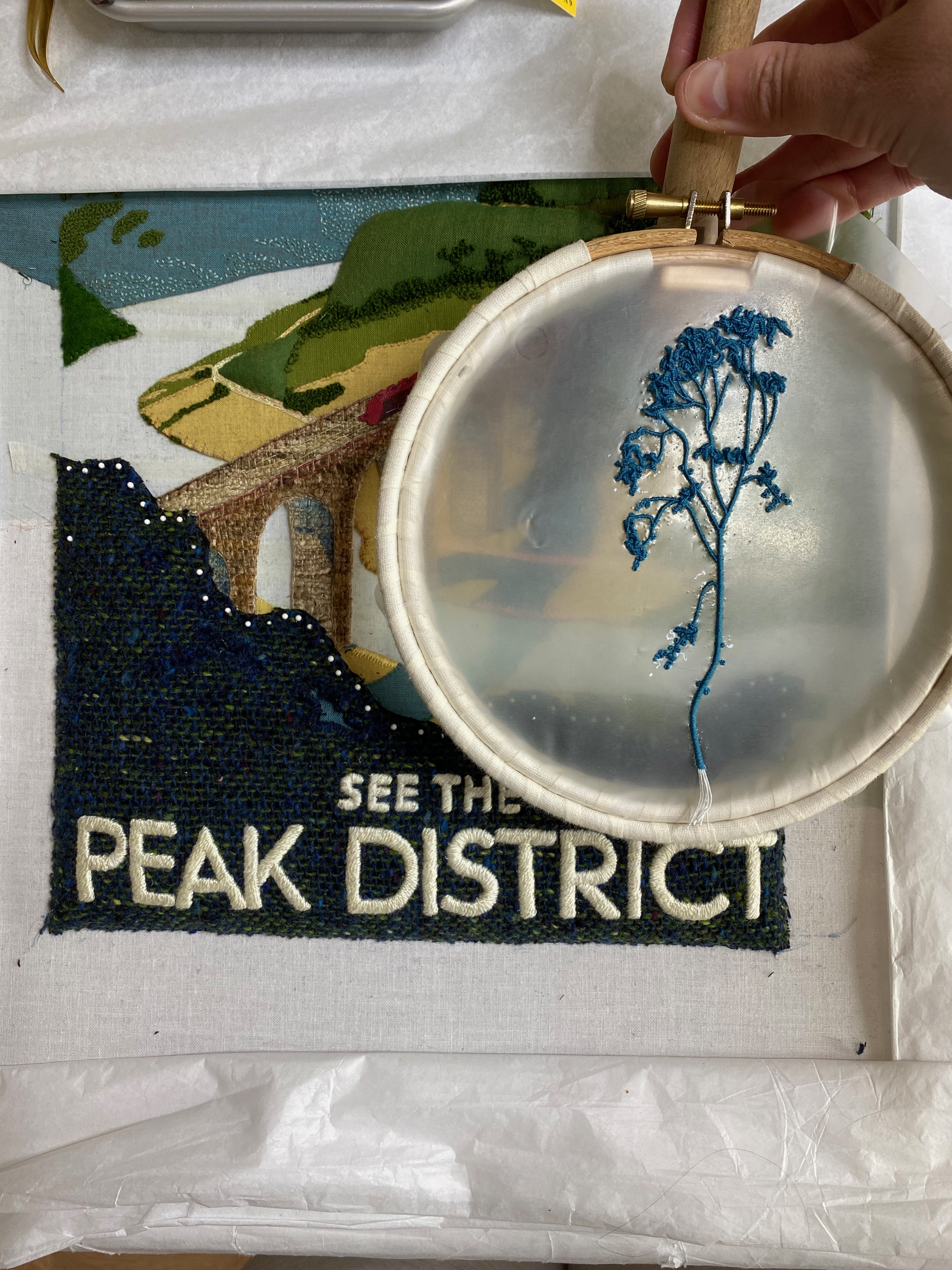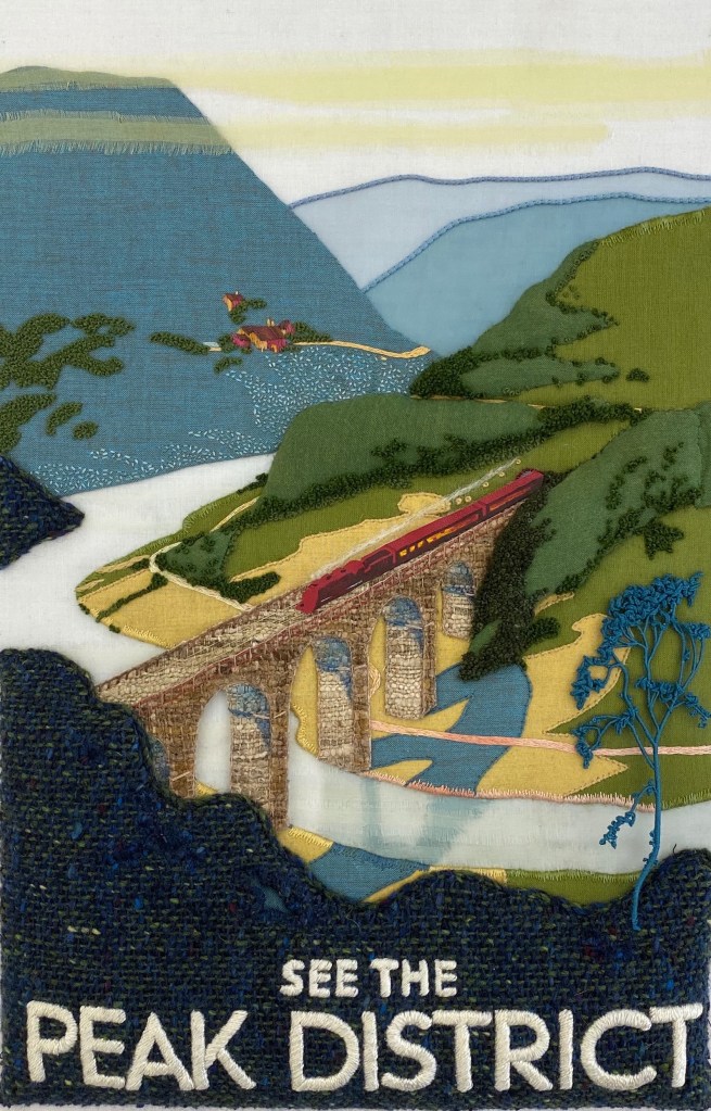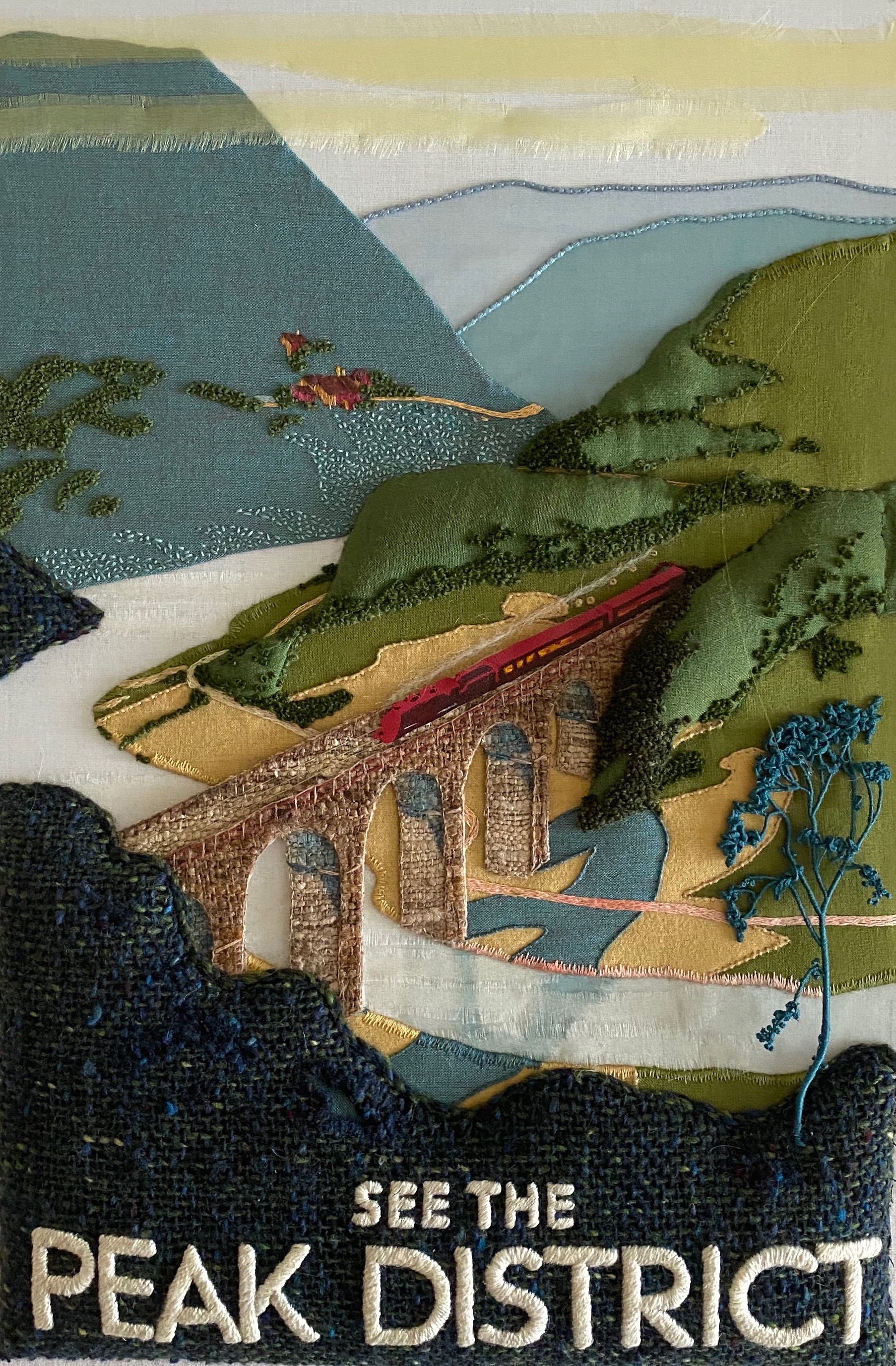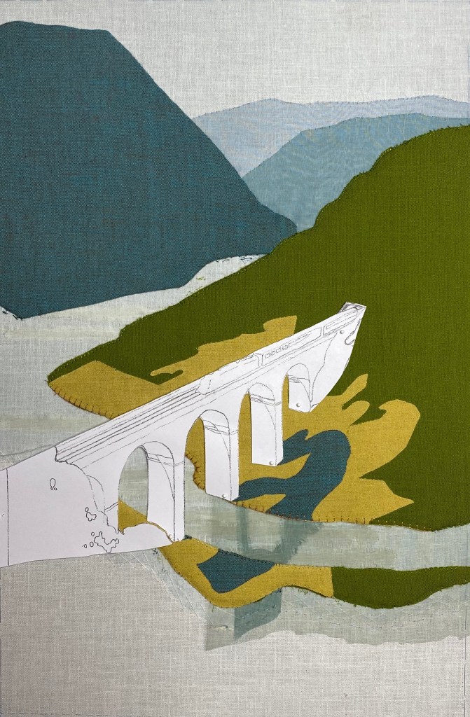 Next I painted on the blue shadows underneath the arches using Derwent Inktense pencils and added some blue stitches for the finer details. As you can see from the pictures I tried different paints and also stitching more of the shadows, but I found that the Inktense pencils worked best. When the entire viaduct was complete I added some Prym fray stop around the edges carefully cut around the buttonhole edges and attached the viaduct to the main design. As the viaduct is sitting over rolling hills and a river valley it wouldn’t have sat flat on the main design. I, therefore, added some felt padding underneath the pylons on the river to create a sense of depth.
