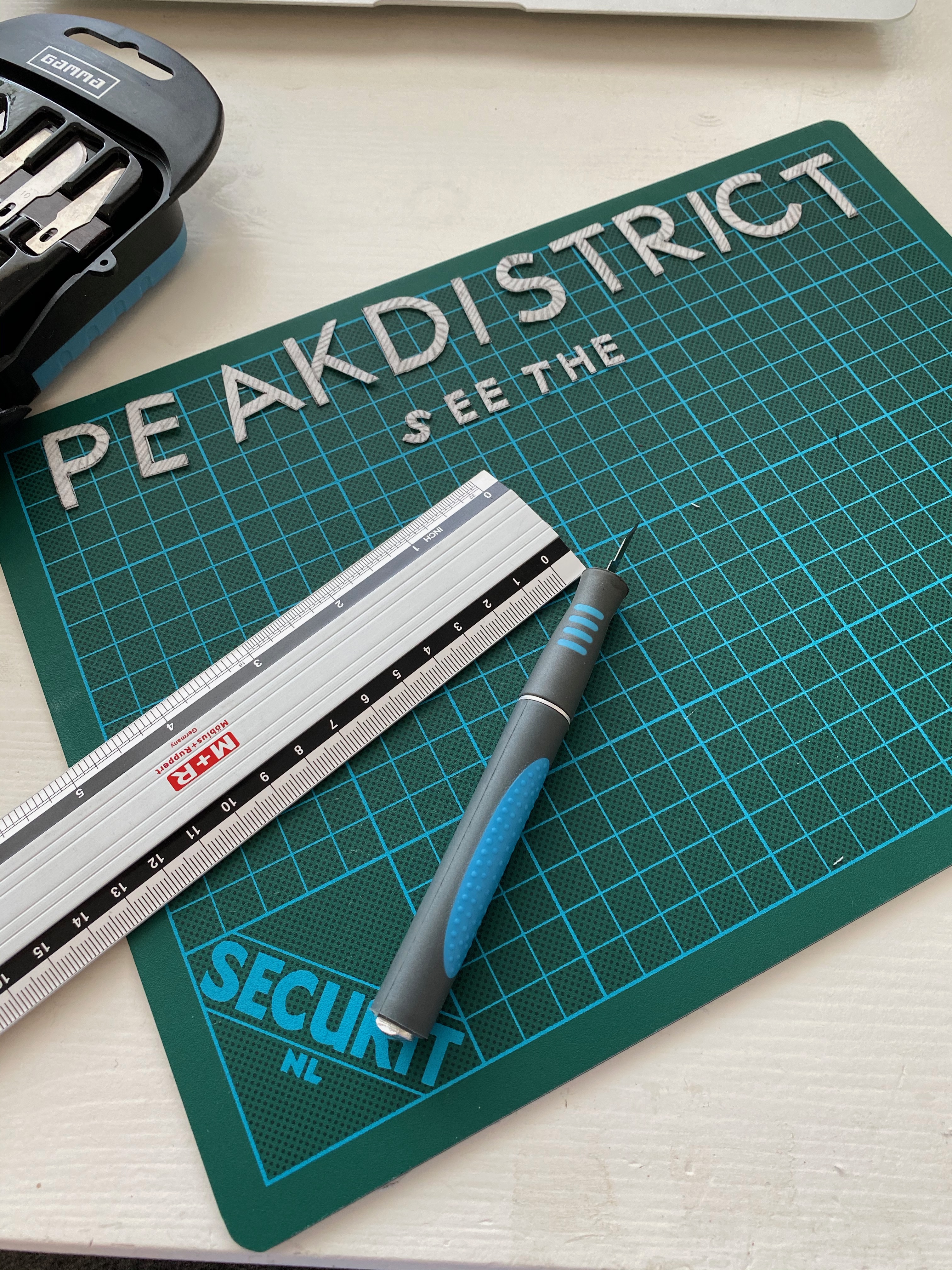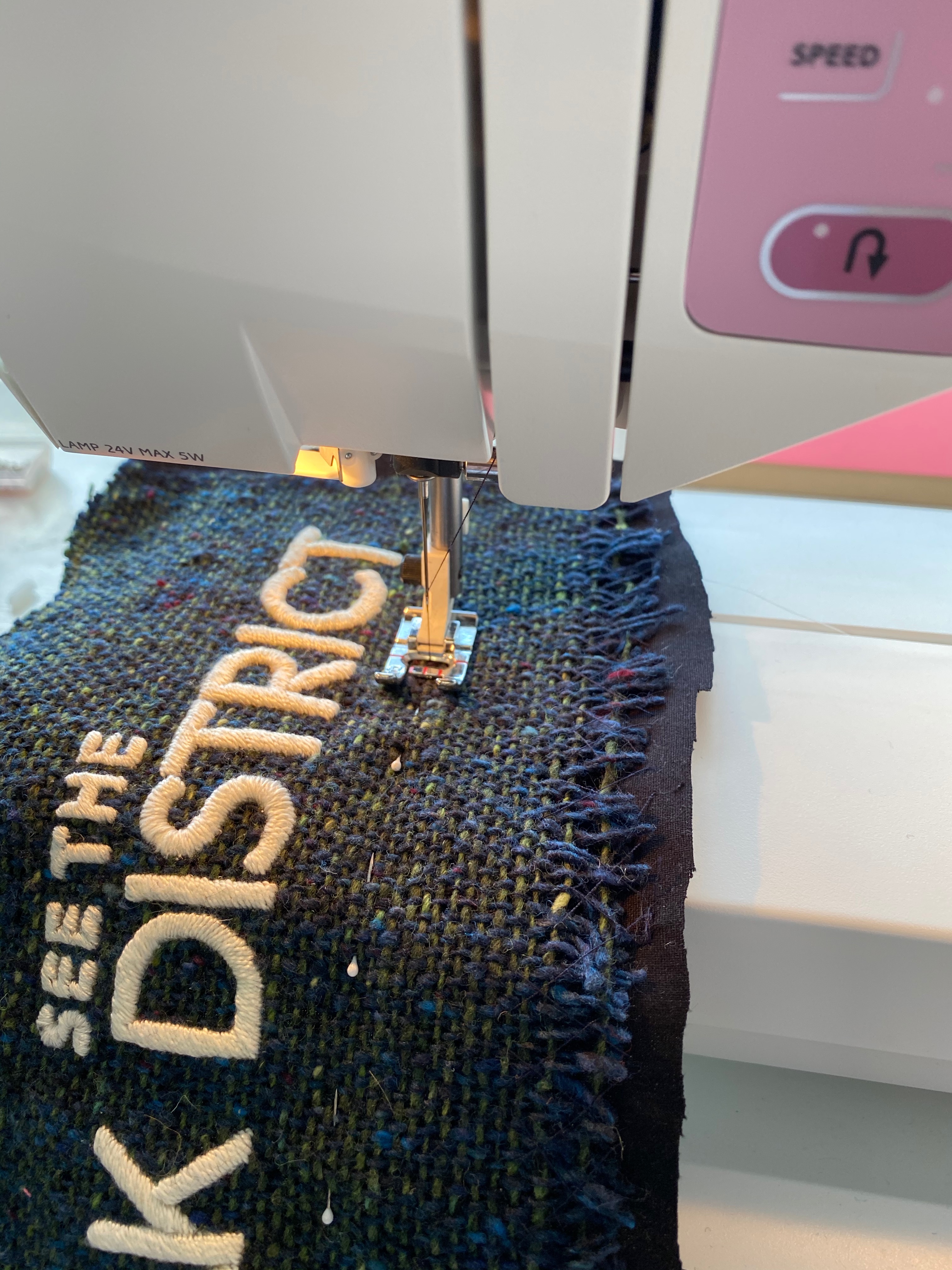 One of the tutors gave me the tip of transferring the text onto soluble fabric and tack that fabric in place. Next I stab stitched pelmet vilene letters in place with directional lines on them for the satin stitch. Once the letters were attached, I carefully cut and pulled away the soluble fabric. Next, I used perlé 5 thread to stitch the larger letters and a stranded cotton in the same colour for the smaller letters.