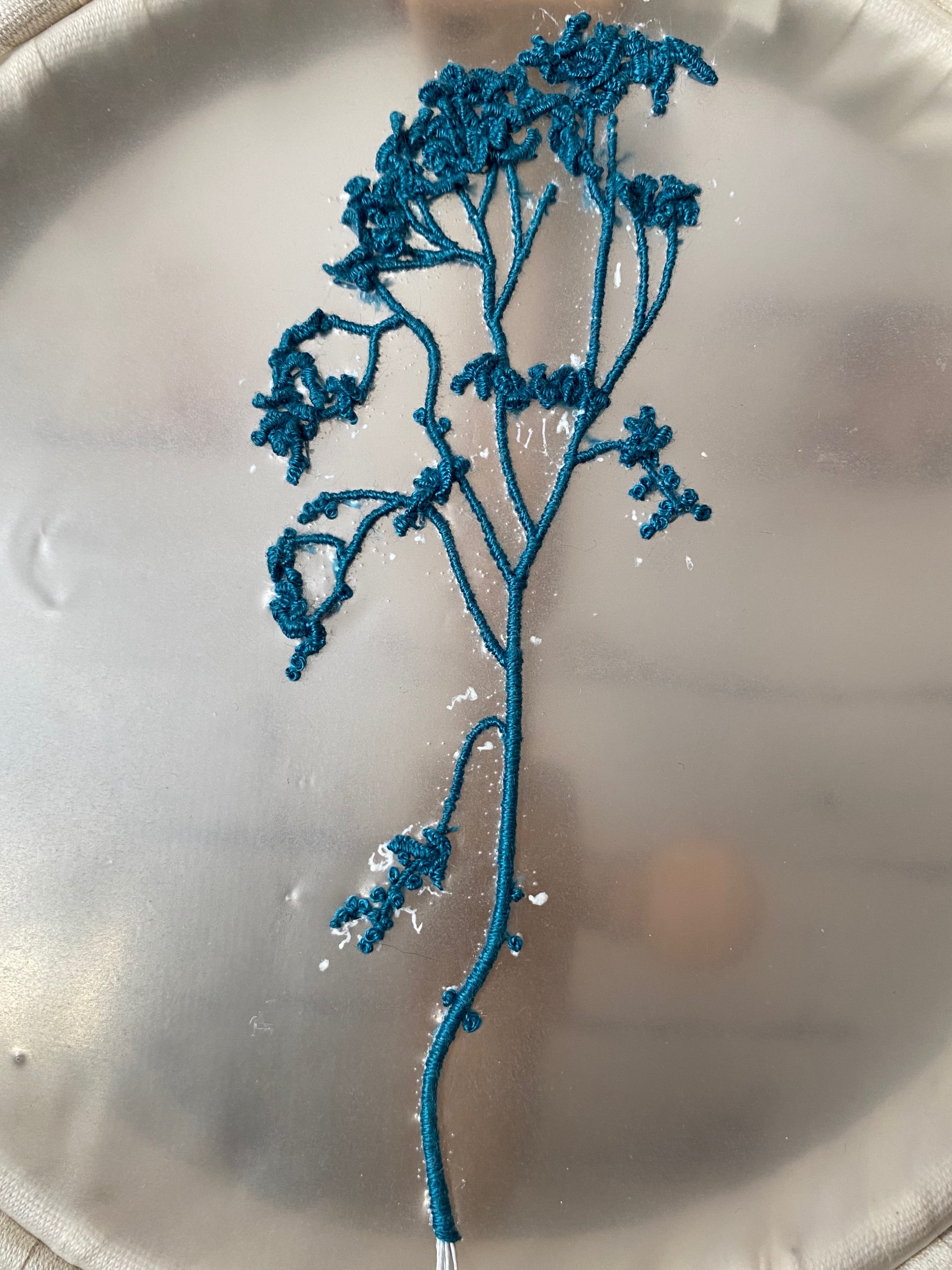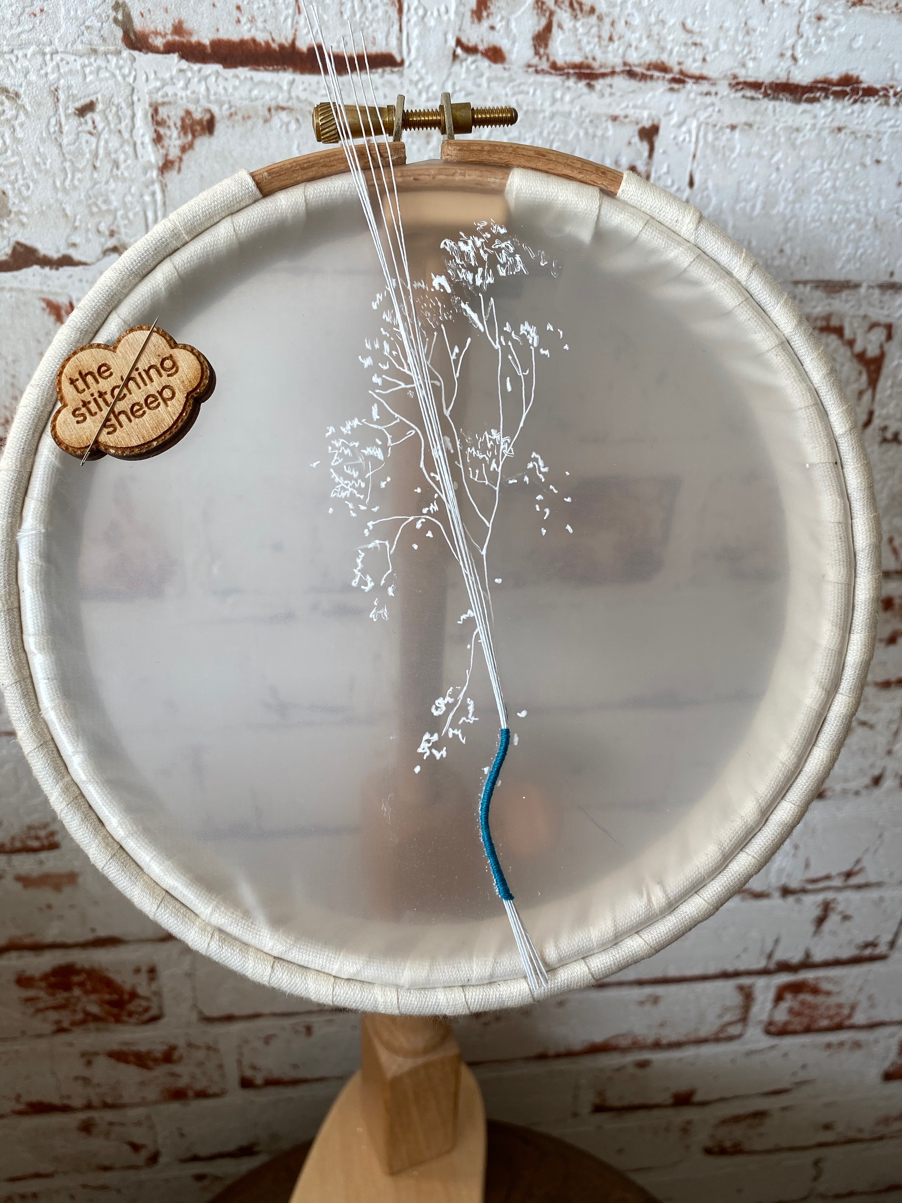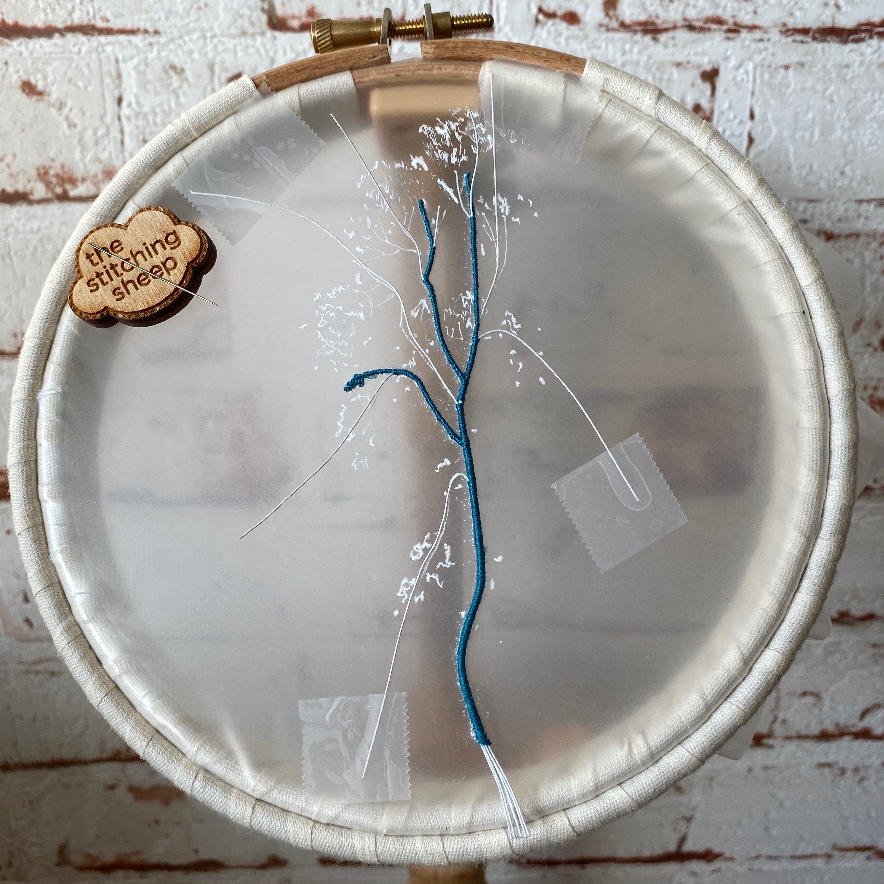 I got the idea for how to make the tree from a kit from Lorna Bateman I made. In it you make a scissor fob by stitching french knots on soluble fabric, making sure all the knots connect by crossing the treads on the back. I did something similar for the tree. I placed some soluble fabric in a hoop and drew on the design of the tree with a white gel pen. Next I cut some florist wires outlining the main branches of the tree. I would then circle the wire with a single strand of stranded cotton attaching it to the soluble fabric in the process, adding smaller pieces of wire for when the tree branched out. When the entire wire shape was covered I would add in drizzle stitches and french knots making sure everything was connected and also attached to the tree. When it was all done I soaked the tree in water to get rid of the soluble fabric and let the tree dry. As the colour wasn’t quite right I did end up soaking the tree again in a tea to get a more muted tone, so the tree wouldn’t stand out as much.