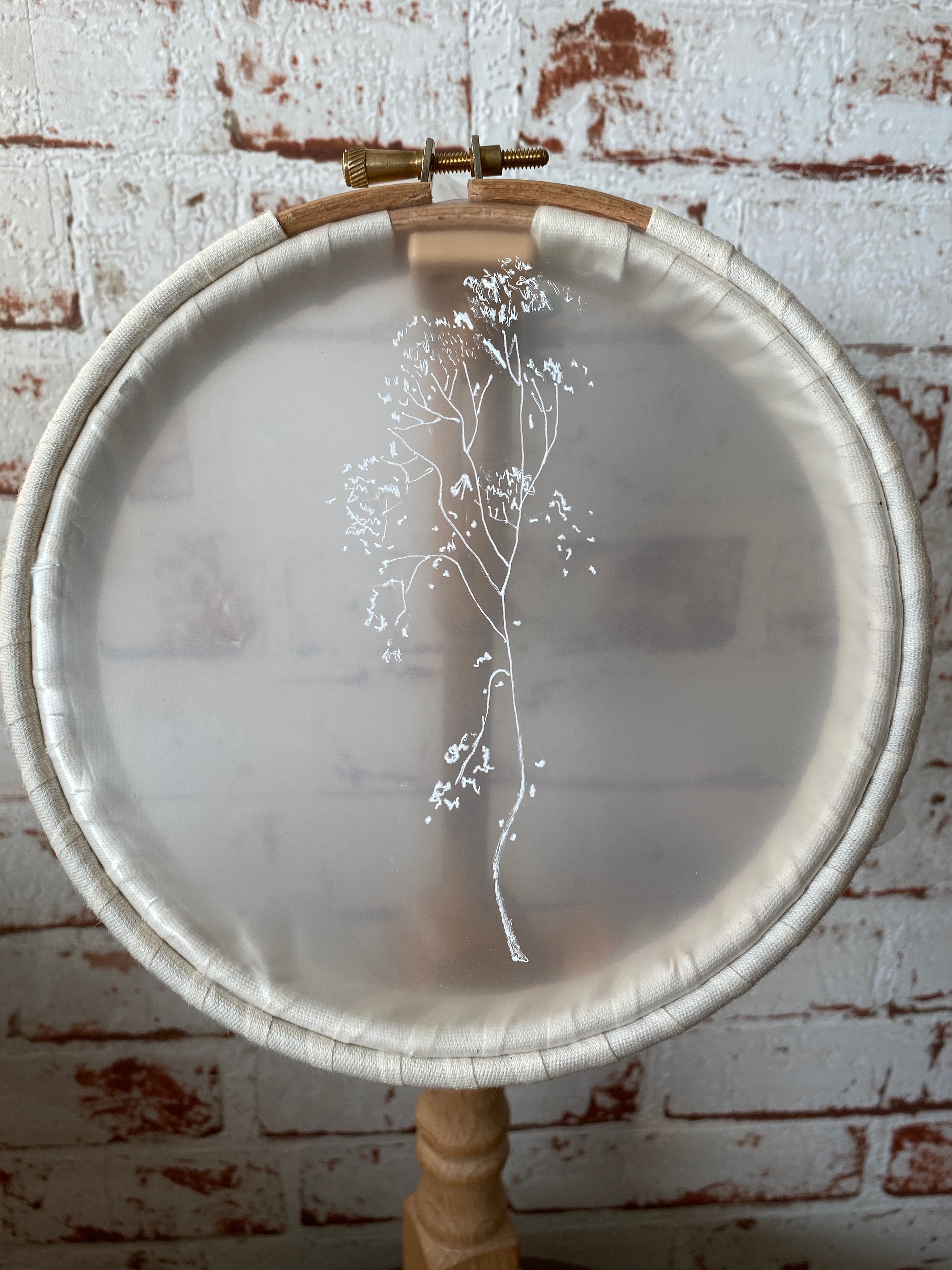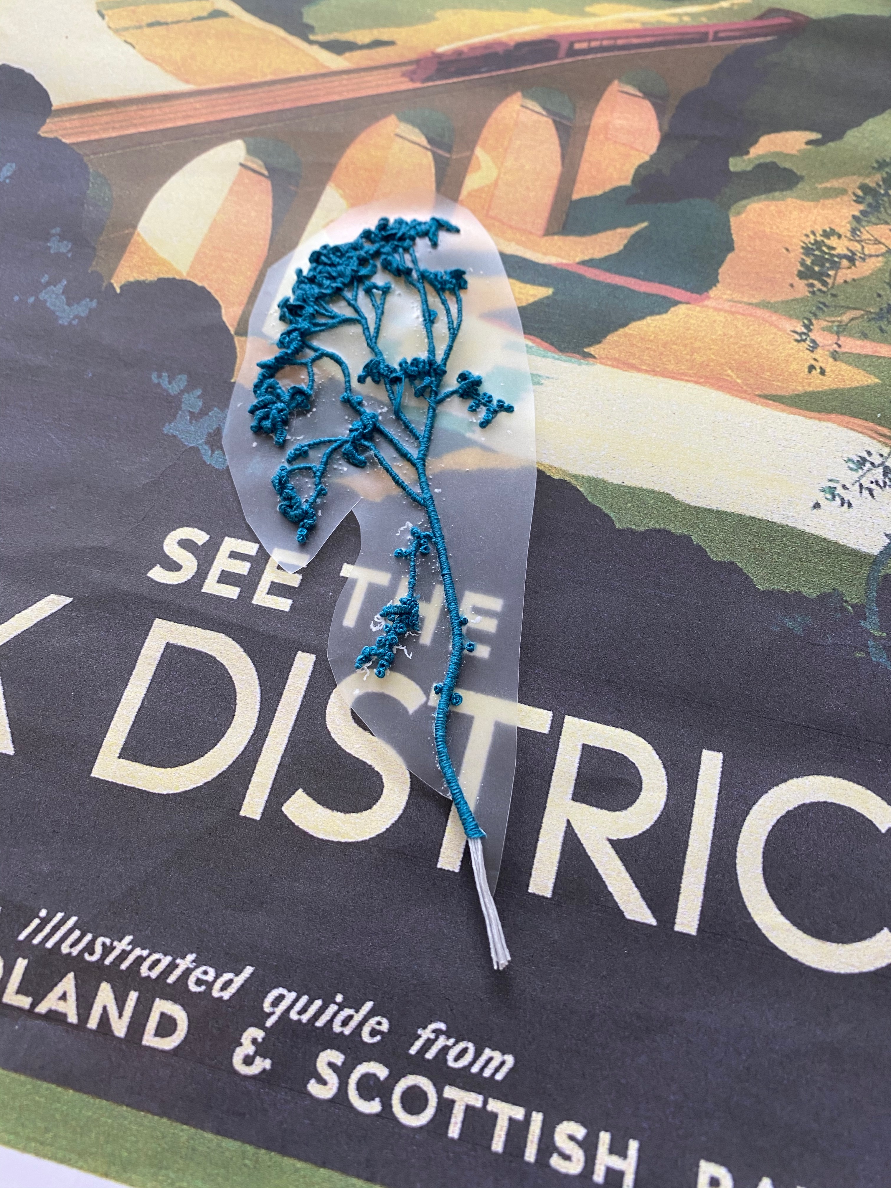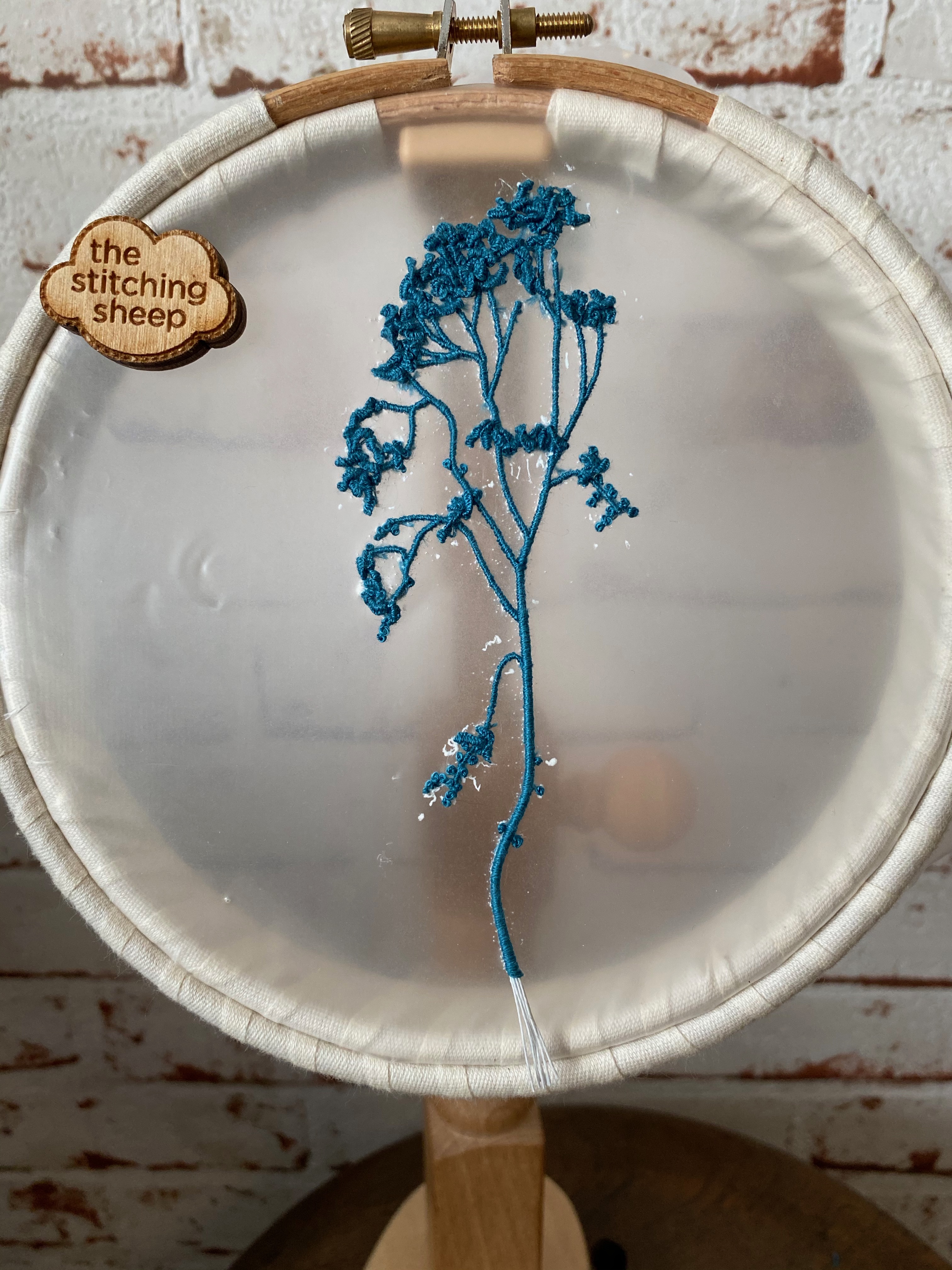 I got the idea for how to make the tree from a kit from Lorna Bateman I made. In it you make a scissor fob by stitching french knots on soluble fabric, making sure all the knots connect by crossing the treads on the back. I did something similar for the tree. I placed some soluble fabric in a hoop and drew on the design of the tree with a white gel pen. Next I cut some florist wires outlining the main branches of the tree. I would then circle the wire with a single strand of stranded cotton attaching it to the soluble fabric in the process, adding smaller pieces of wire for when the tree branched out. When the entire wire shape was covered I would add in drizzle stitches and french knots making sure everything was connected and also attached to the tree. When it was all done I soaked the tree in water to get rid of the soluble fabric and let the tree dry. As the colour wasn’t quite right I did end up soaking the tree again in a tea to get a more muted tone, so the tree wouldn’t stand out as much.